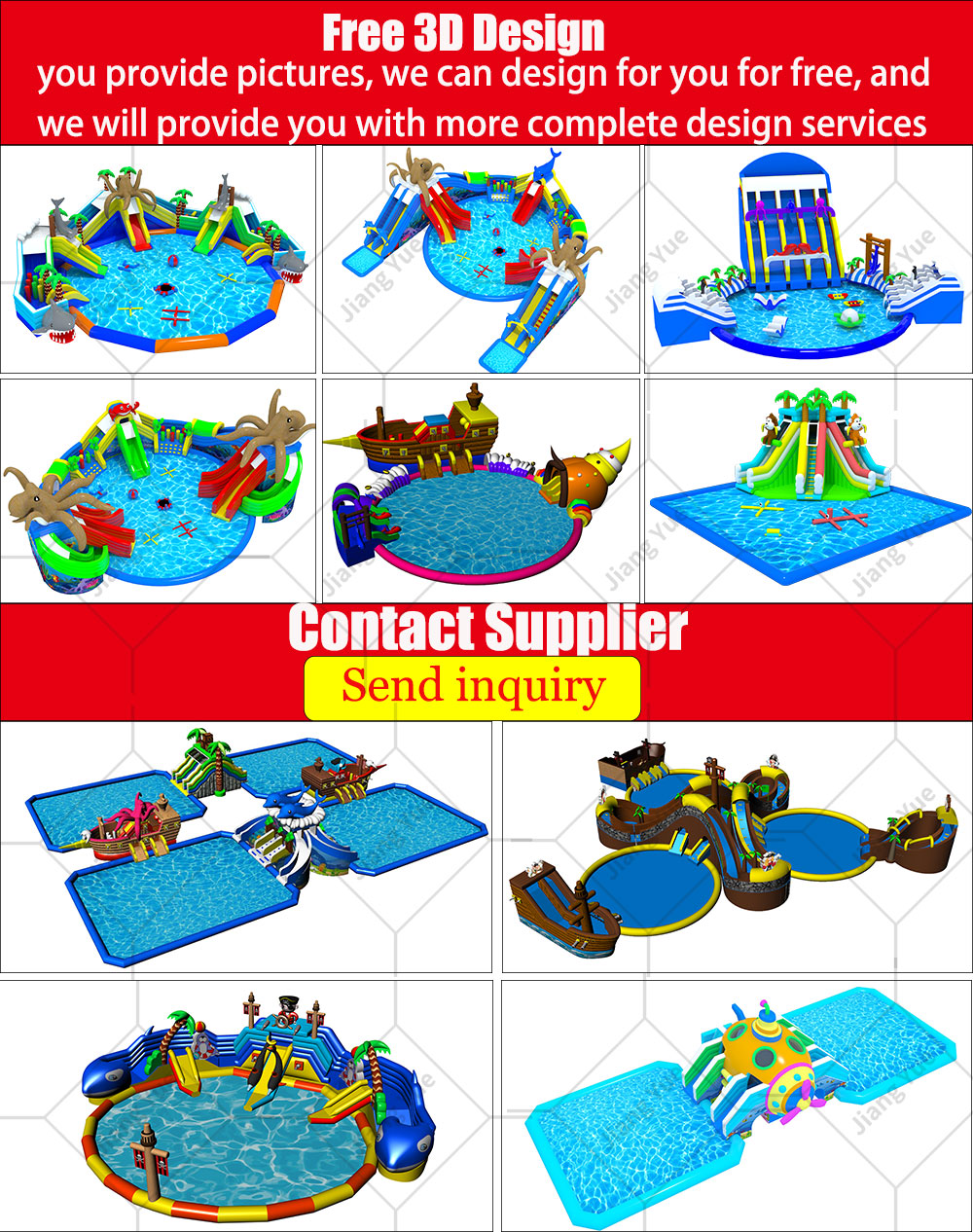 Jiang Yue has been concentrated in inflatable toys for many years and is able to custom make any inflatable products according to customers' requirements, such as inflatable bouncers, castles, slides, combos and more. Our water slides(the longest slide in Dubai is made by us), water parks(more than 2000 sucessful cases both home and abroad), inflatable tents (inflatable/airtight/EXTRA giant) and inflatable toys (land/pool/lake/ocean) have earned ourselves a good reputation for the excellent quality, fast production, prompt delivery and price!
